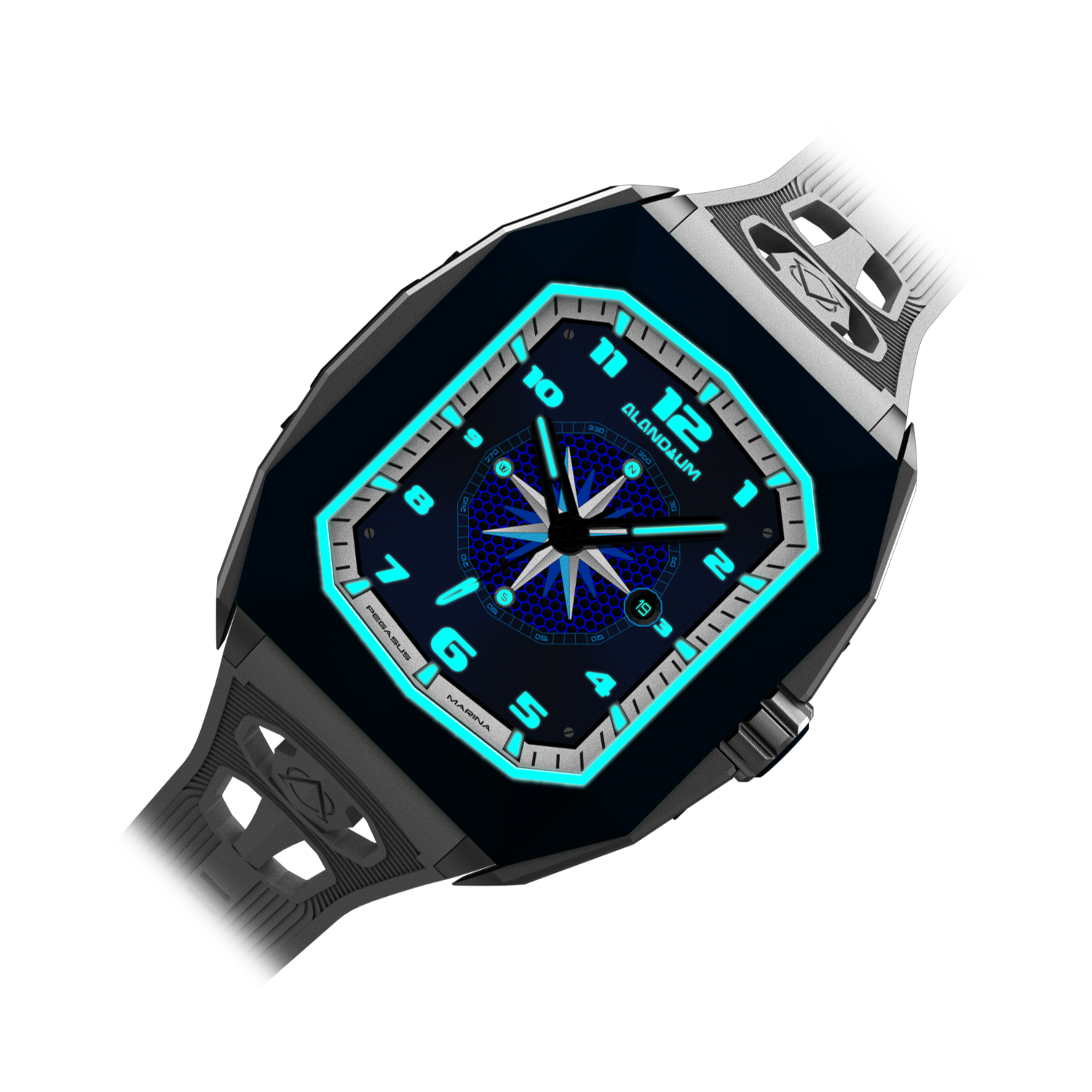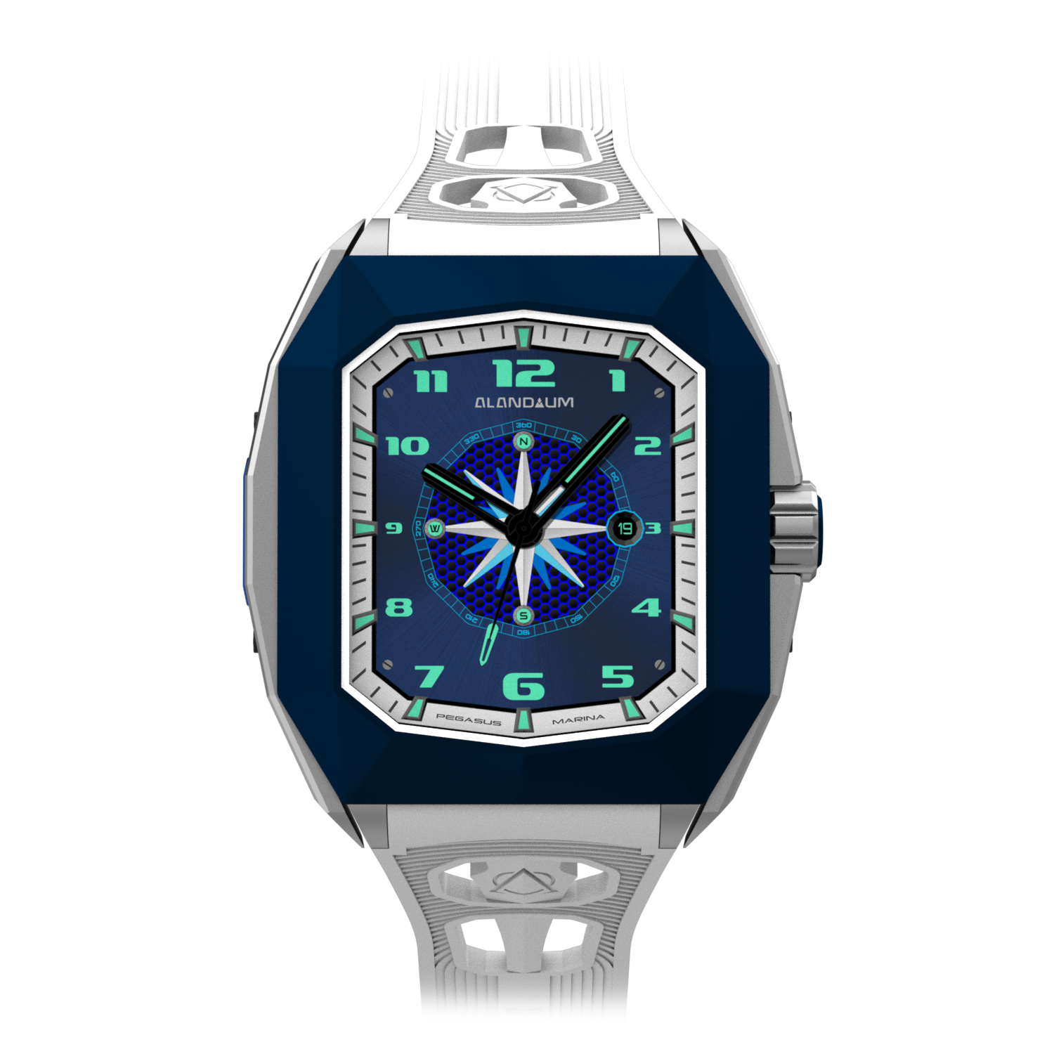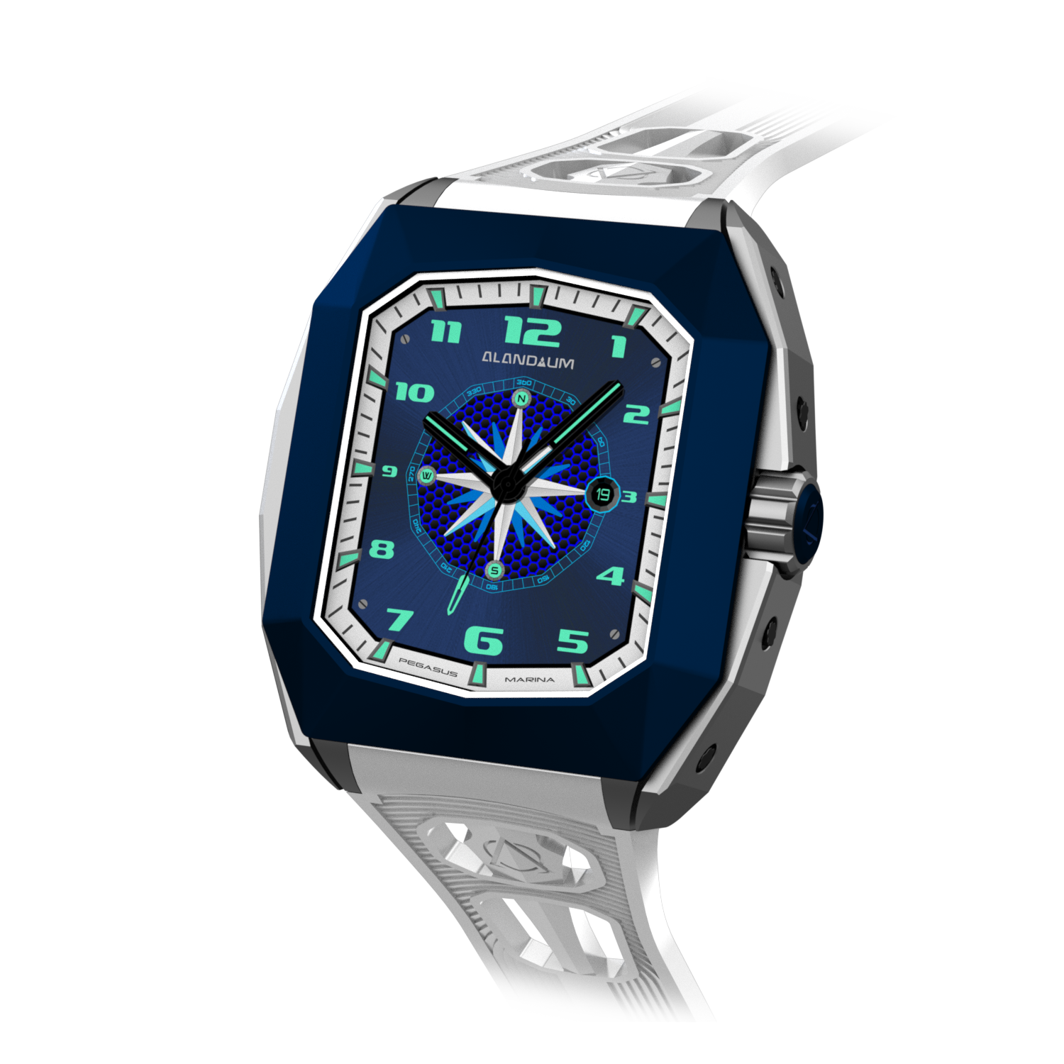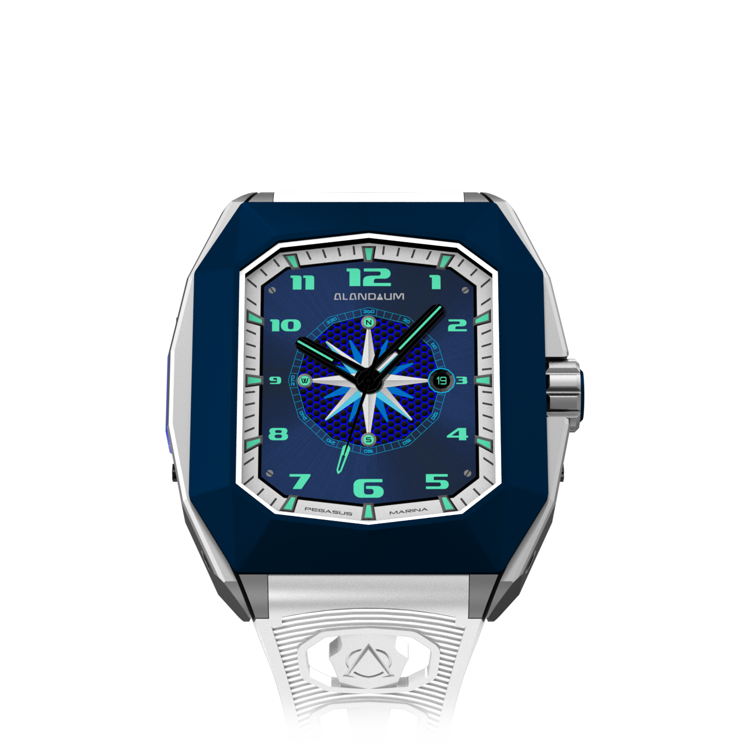 As night falls, Bahr Al Turath Navy White awakens with a luminescent glow, echoing the moonlight reflecting on the open sea. Coated in Swiss Super-LumiNova, its navy blue dial takes on a new depth, like waves shimmering under the stars. A perfect fusion of elegance and function, it stands as a guiding light for those who navigate the unknown—wherever the tide may lead.
