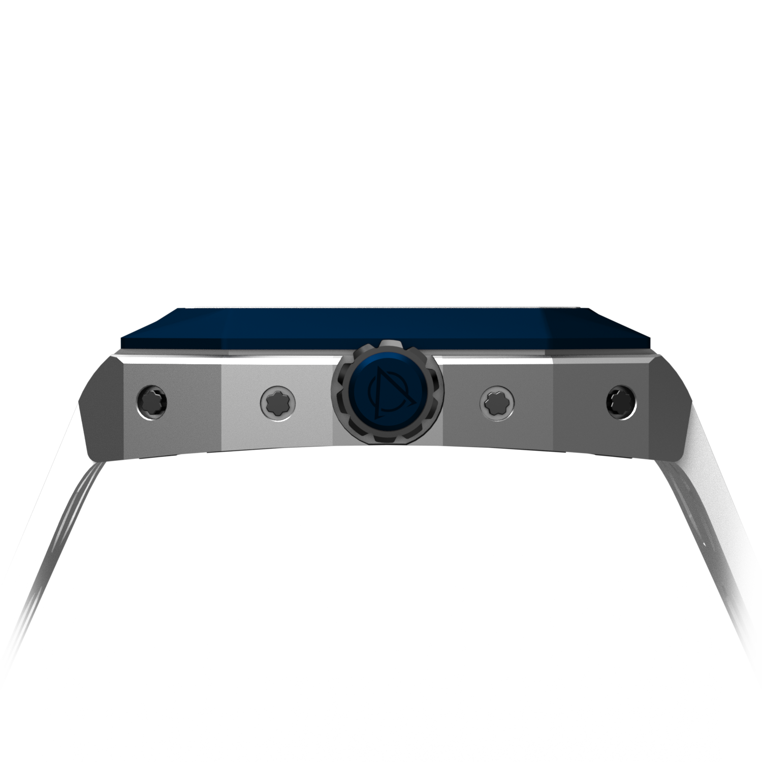 The case features a one-of-a-kind geometry, unlike any other watch in the world, making it truly unique in design and structure. The case frame is made entirely of Pure Titanium, being ultra-light and incredibly strong with side inserts, from 316L Stainless Steel. The entire case is decorated with a specially designed Geneva pattern on the surface and a badged unique panel underneath for added distinction. To achieve its precise form, the case undergoes multiple gravity presses, requiring at least 400 tons of heavy machinery to shape it to perfection.