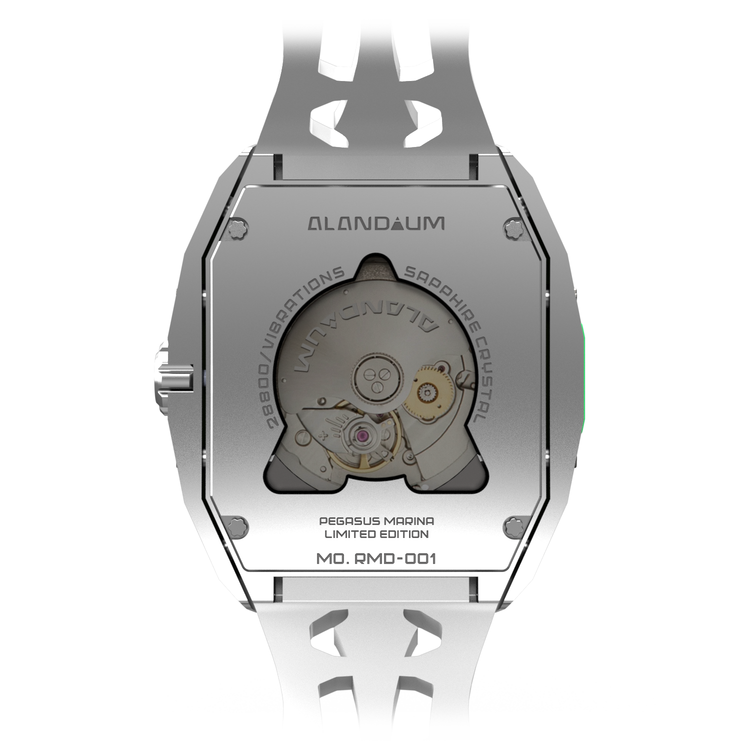 The case back has a unique designed sapphire crystal, that reveals the custom rotor, a true testament to fine watchmaking. Installed with hexagonal titanium screws, every element is meticulously designed to harmonize with your wrist. The engraved "Limited Edition" and the watch’s unique number, highlight its rarity and exclusivity. This special design invites you to admire the heart of the watch.