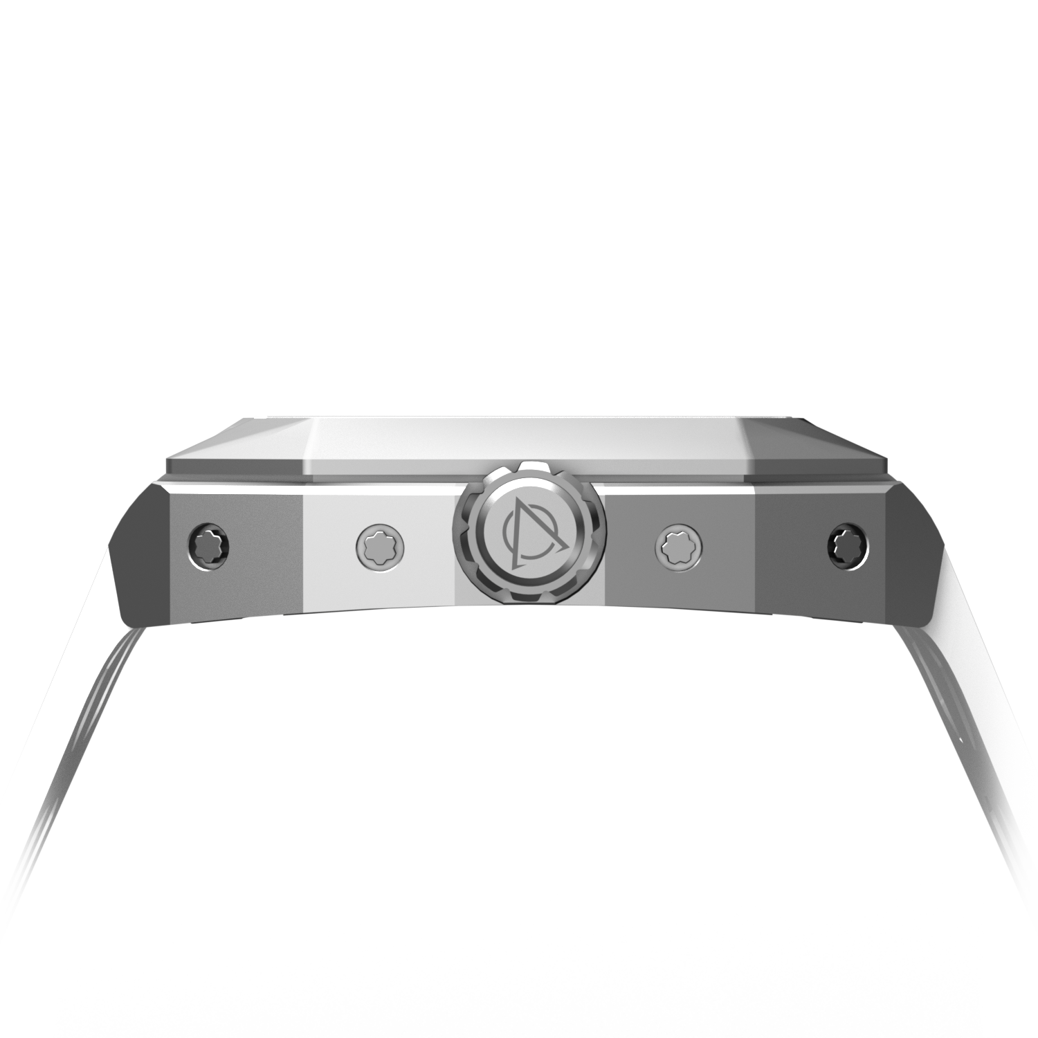 The case features a one-of-a-kind geometry, unlike any other watch in the world, making it truly unique in design and structure. The case frame is made entirely of Pure Titanium, being ultra-light and incredibly strong with side inserts, from 316L Stainless Steel. The entire case is decorated with a specially designed Geneva pattern on the surface and a badged unique panel underneath for added distinction. To achieve its precise form, the case undergoes multiple gravity presses, requiring at least 400 tons of heavy machinery to shape it to perfection.