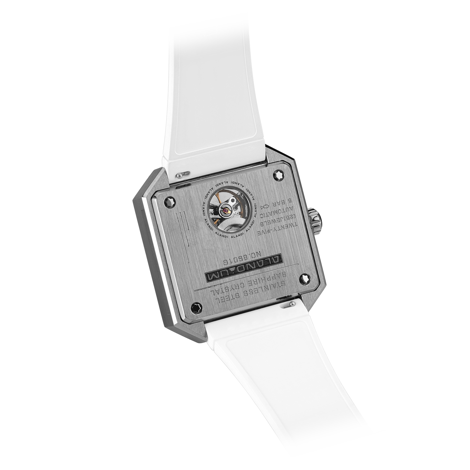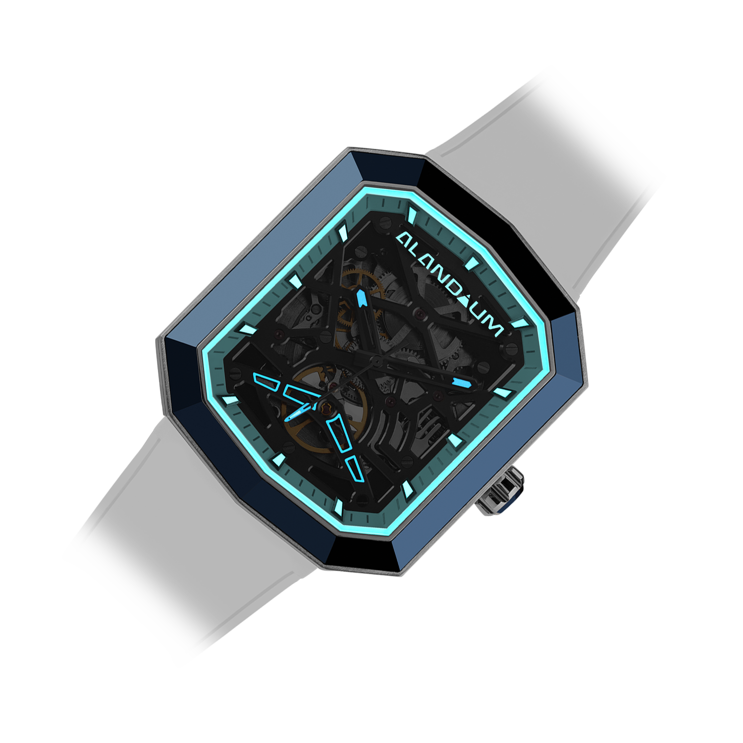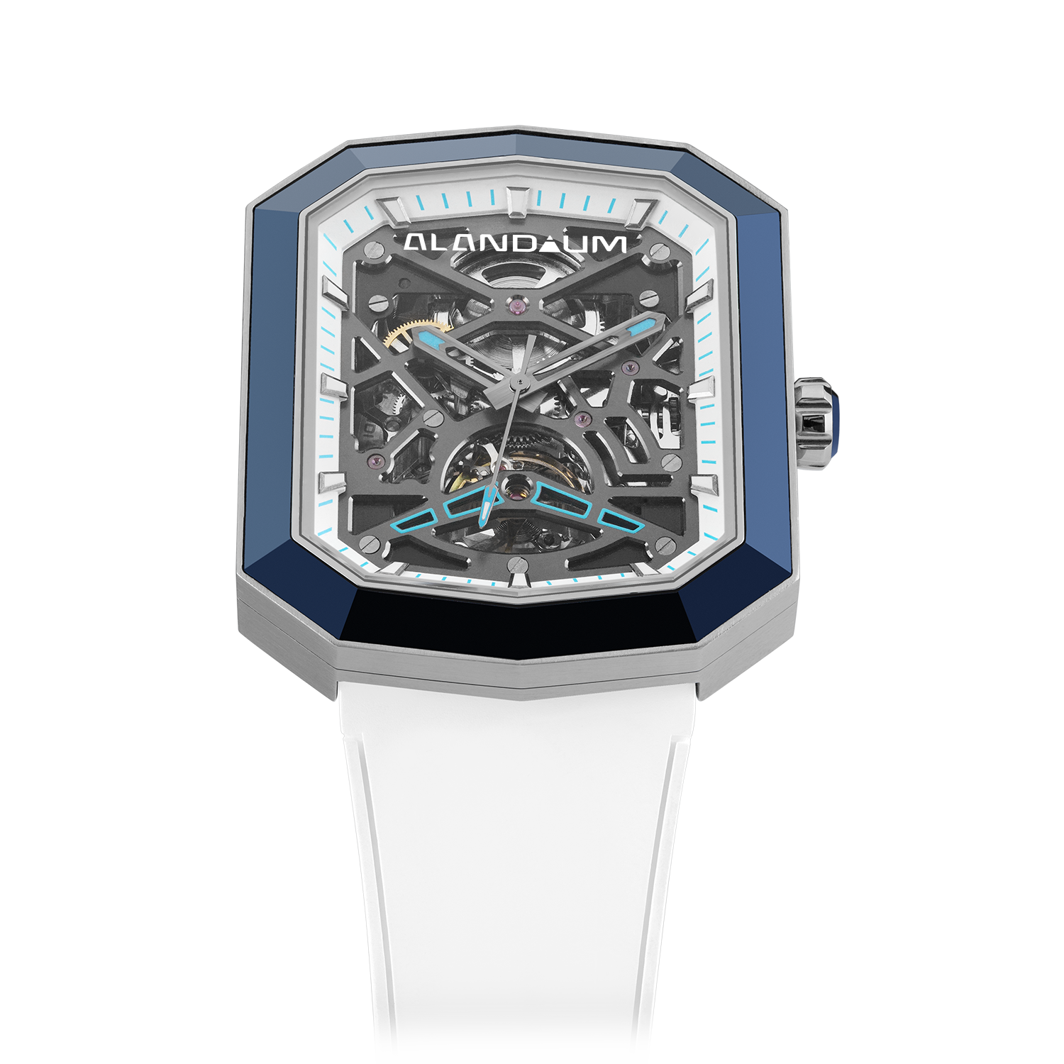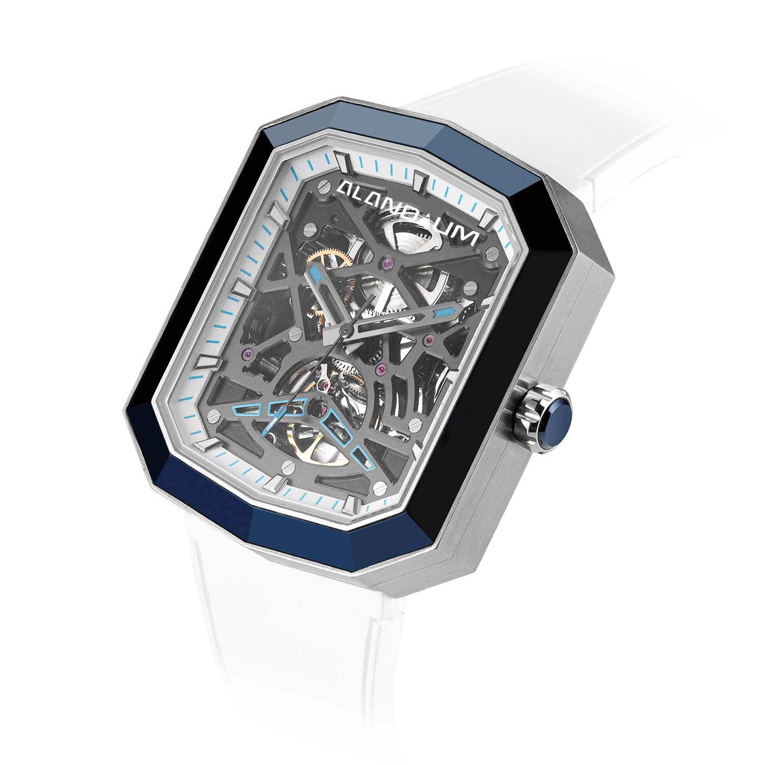 The skeleton dial reveals the intricate ballet of the in-house movement, a testament to our dedication to precision and artistry. The Blue case and pure white rubber strap, symbolize the ethereal connection between sky and ice.