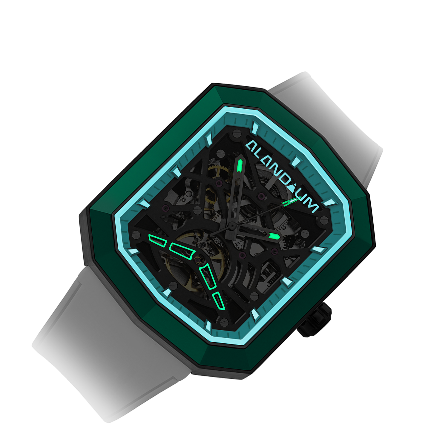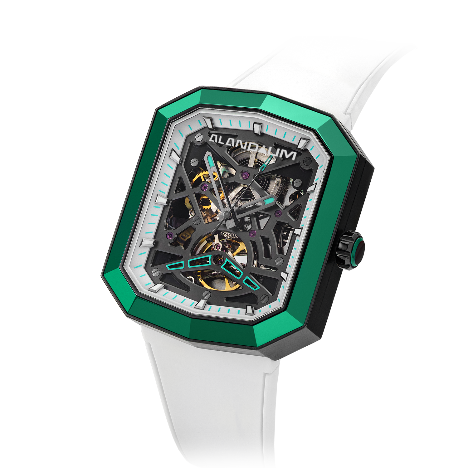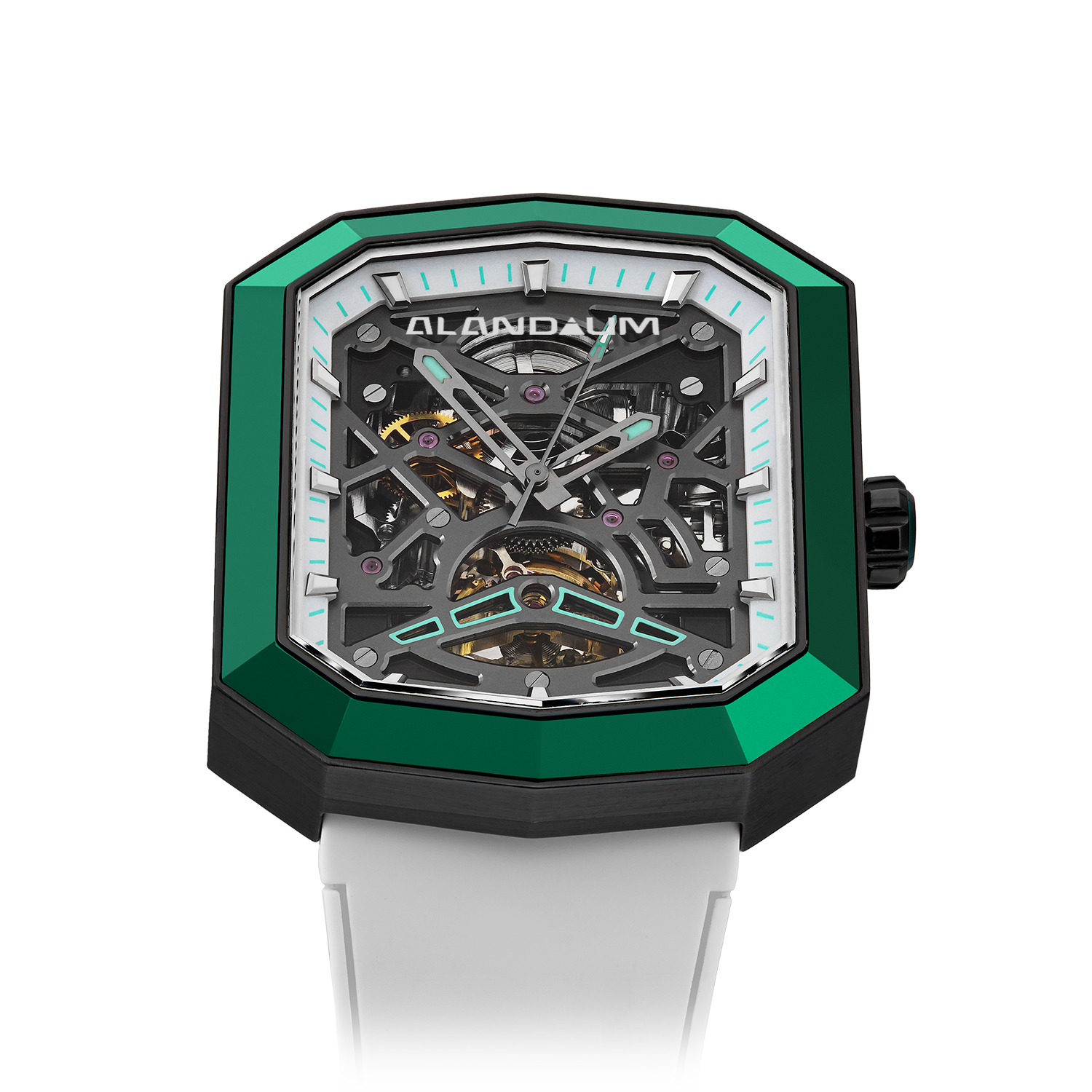 The striking emerald green case is a reflection of the legendary energy of Krypton, encapsulating strength and resilience. The skeleton dial reveals the in-house developed movement working in perfect harmony with every gear, spring, and component.