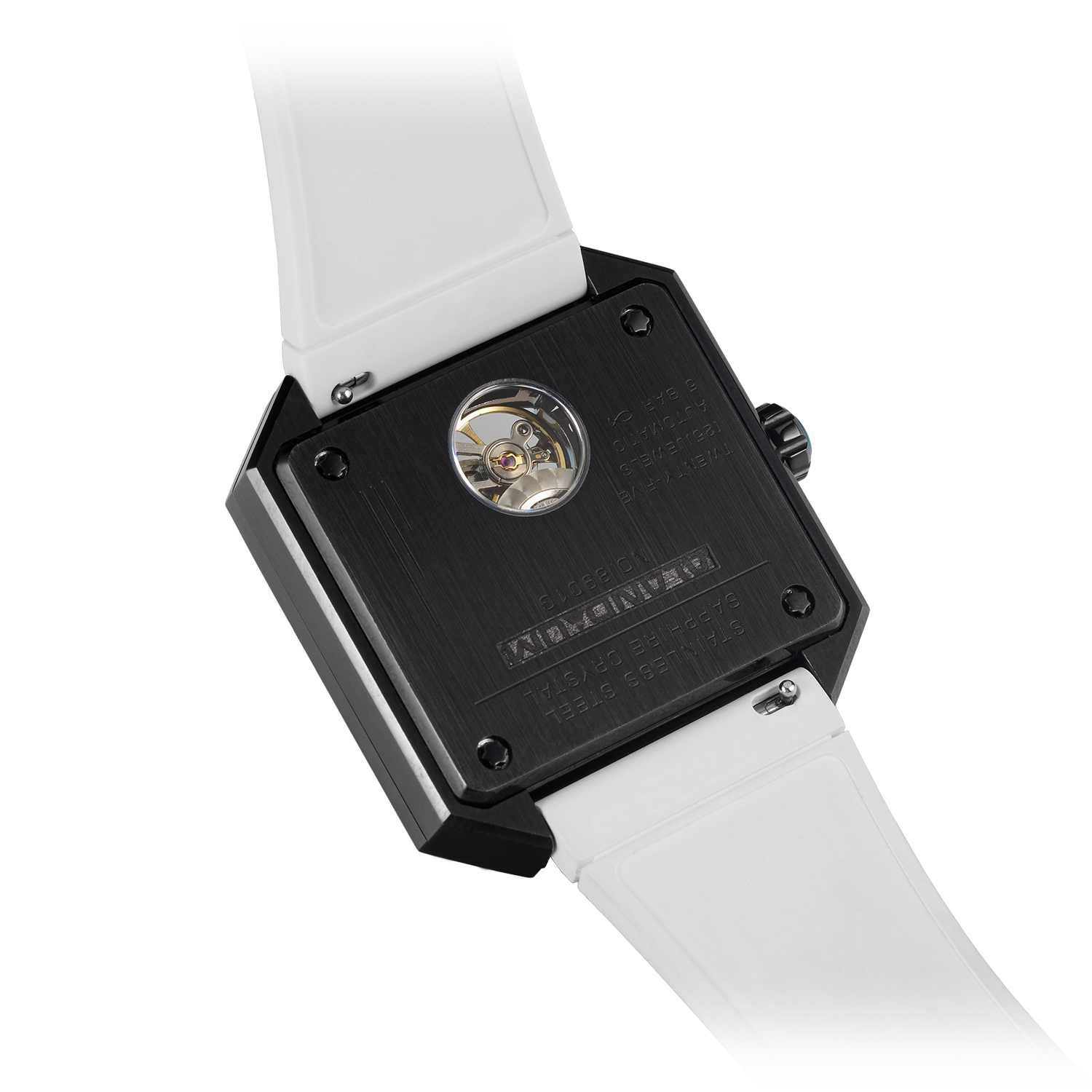 Paired with the white rubber strap, the design evokes the clarity and precision of a high-performance machine, ready to conquer any challenge.
