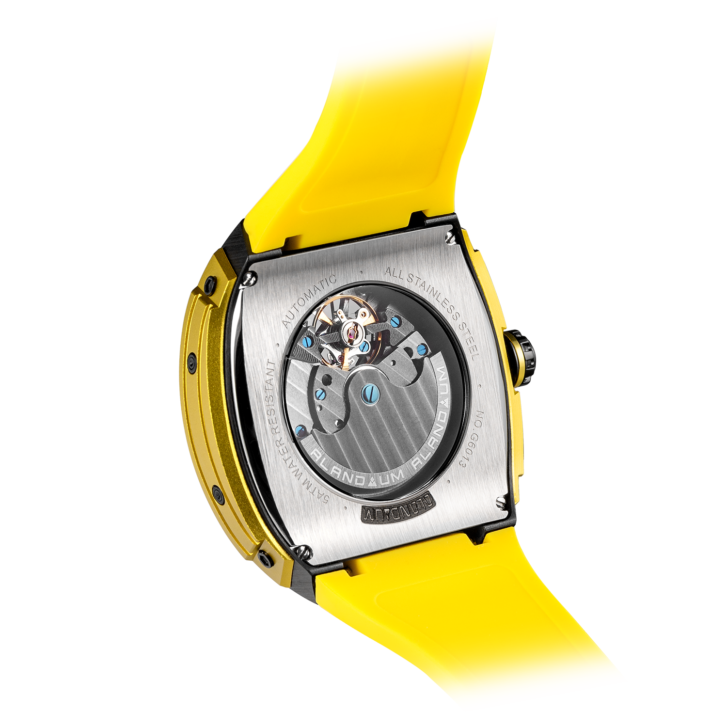 The curved stainless steel case features bold yellow accents, mirroring the vibrancy of the strap. Like a burst of sunshine on the dial, tiny yellow details add a playful touch to the functional masterpiece beneath.