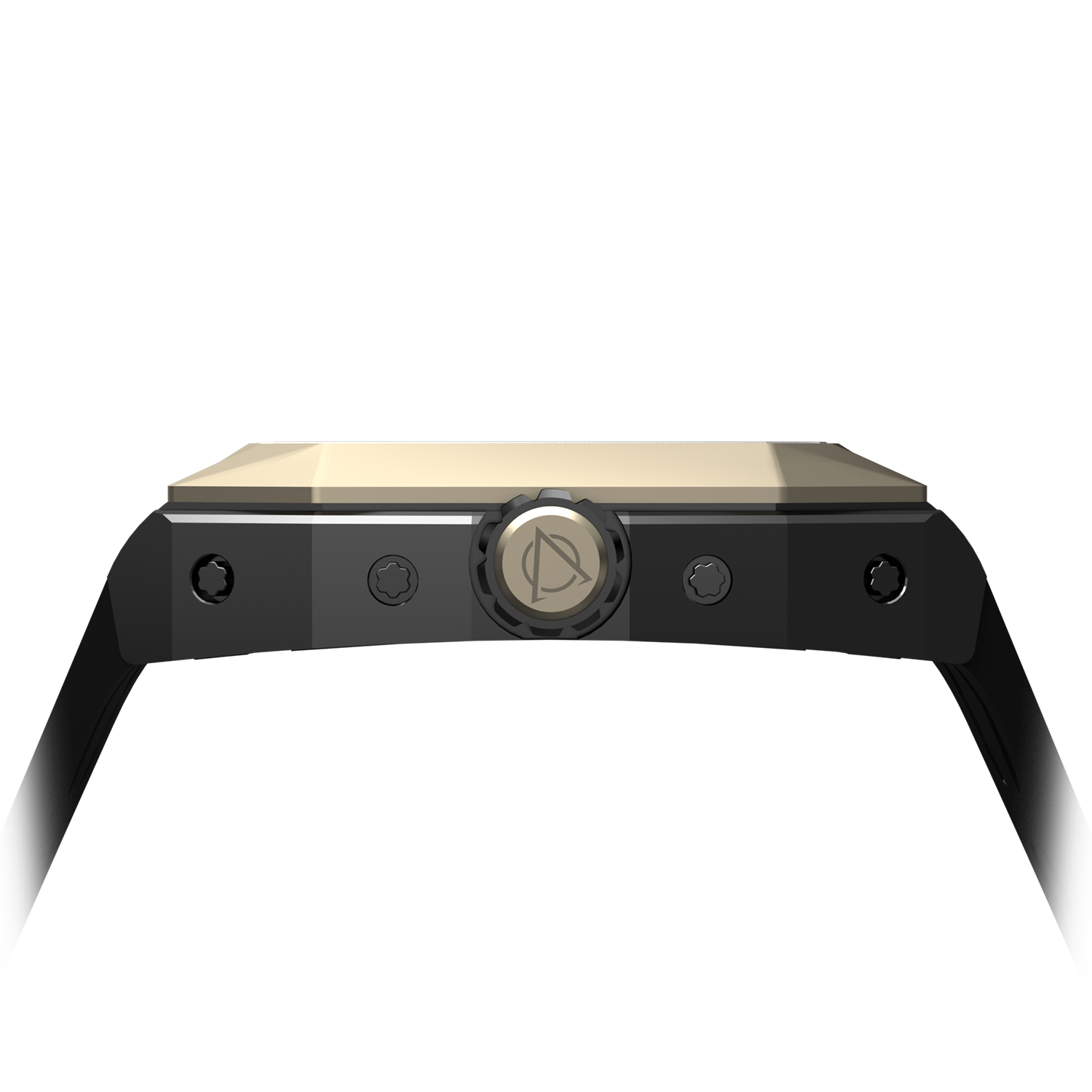 The side view features a crown, framed by 316L stainless steel inserts with polished and PVD-plated finishes. The clean, geometric lines of the case create a balanced and modern silhouette, blending sharp edges with smooth curves. This thoughtful design highlights the watch’s attention to detail and timeless craftsmanship.
